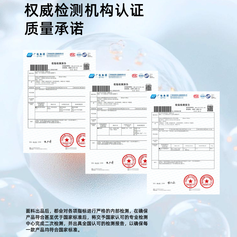 面料出品后,都会对各项指标进行严格的内部检测,在确保产品符合甚至优于国家标准后,将交予国家认可的专业检测中心完成二次检测,并出具全国认可的检测报告,以确保每一款产品均符合国家标准。