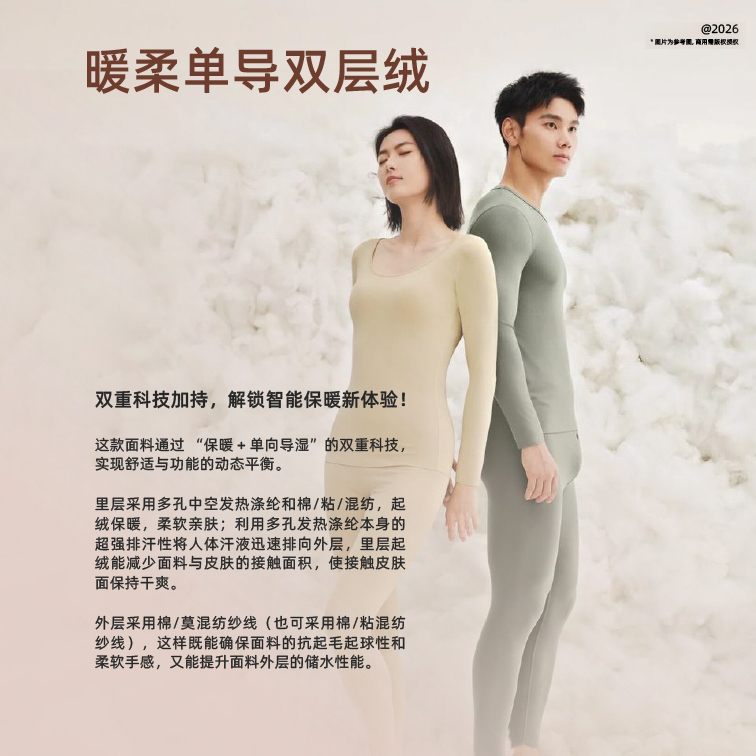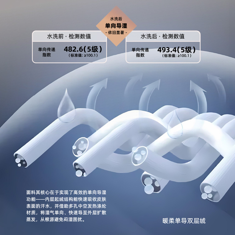 这款面料通过“保暖+单向导湿”的双重科技,实现舒适与功能的动态平衡。