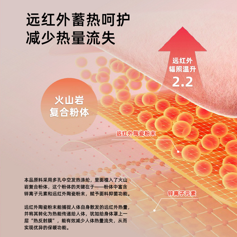 本品原料采用多孔中空发热涤纶,里面植入了火山岩复合粉体,这个粉体的关键在于一-粉体中富含锌离子元素和远红外陶瓷粉末,赋予面料抑菌功能。远红外陶瓷粉末能捕捉人体自身散发的远红外热量,并将其转化为热能传递给人体,犹如给身体罩上一层“热反射膜”,能有效减少人体热量流失,从而实现优异的保暖功能。